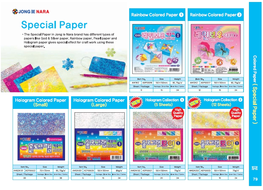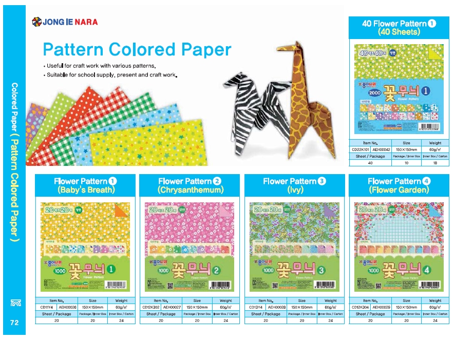 | 会社特徴・事業内容 | (株)ジョンイナラは1972年設立され韓国で最初に折り紙 製造に‘グラビア印刷方式’の大量生産システム設備を導入して 折り紙の製造標準を先導する国内外トップクラスの折り紙製造 会社に成長しました。なお、折り紙以外にも工芸、ファンシー、 幼児教育に関わる最高の製品を開発しようとする経営理念の持 続的な実践の結果、‘ナラのり’、‘万能接着剤’、‘粘土ナラ’など の製品を開発して文具および教育教材専門製造企業に成長を続 けてまいりました。 1988年には折り紙と紙文化の教育および普及のため図書 出版ジョンイナラを設立し文具および教育専門企業に事業分野 を拡張して全世界60カ国以上の国へ製品を輸出する快挙を成 し遂げました。 (株)ジョンイナラは企業の社会的責任を最優先とする創立者の 理念に従い紙文化財団を設立し折り紙および紙文化教育を通じ て子供からお年寄りまで多様な教育およびボランティア活動を して文化底辺拡大および紙文化の世界化にも先立って進んでい ます。なお(株)ジョンイナラに位置しているジョンイナラ博物 館は紙文化芸術作品の公募を通じて韓国内外の優秀な紙文化作 品の発掘および展示をし、多様な体験学習を提供する文化伝道 師の役割を担っています。 |